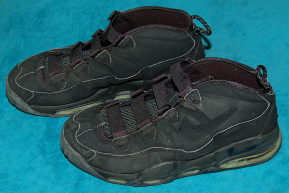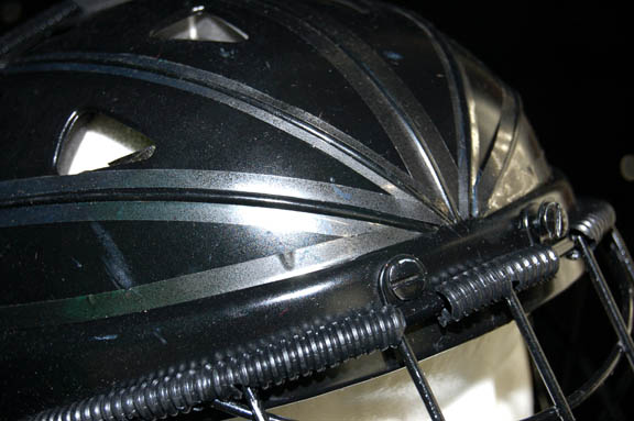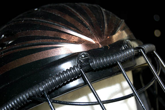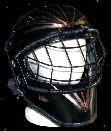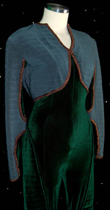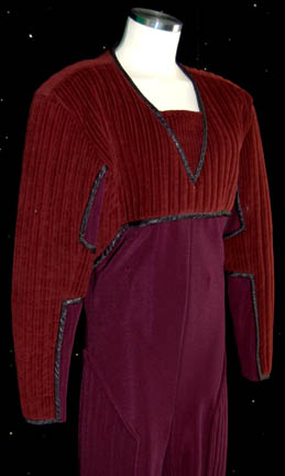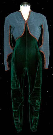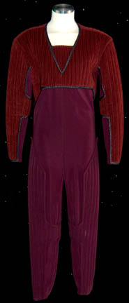 Description: “Kira Nerys” (Nana Visitor) was a Bajoran female who was a Colonel in the Bajoran Militia and later a Bajoran liaison officer on Deep Space Nine. This is her stunt Springball costume made for wear by Visitor's stunt double in the Star Trek: Deep Space Nine episode “For the Cause” in which she was shown winning a Springball game. The costume includes an emerald green jumpsuit with quilted padding down the side of each leg. The torso and sleeves are quilted dark teal with metallic copper color trim and there is a zip up the front. Also included is a black face mask with dulled metallic copper color strips attached to the front. Kira’s Bajoran opponent costume is a dark purple jumpsuit with quilted padding down the side of each leg. The torso and sleeves are quilted brown with black trim. There is a zip up the back. The corresponding face mask is black with dulled metallic silver color strips attached to the front. The clasp on the left side is broken. Also included are matching black tennis shoes. Costumes come complete with costume tags.