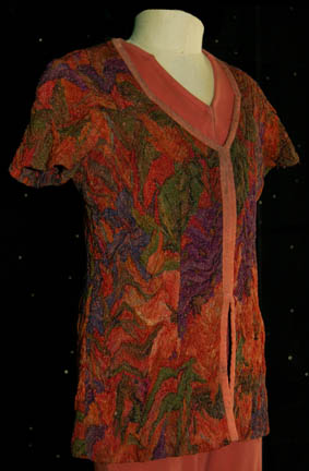 Description: A costume featured in the Star Trek: Deep Space Nine episode “Yesterday's Children”; wherein the “Defiant” find a planet peopled by their descendants and find that they will go back in time 200 years and crash land on this planet in two days when they try to leave. This costume is for wear by Davida Williams a child descendant of “Jadzia Dax” (Terry Farrell), “Lisa”, and is a short-sleeved, full-length, jumpsuit in an orange rust color with stirrups for the feet and a short sleeved, shirt featuring a multi-colored, textured, wrinkled feel to it, orange trim, and a zip down the front. Items were distressed for effect, sewn in tags denote wear later in episodes of Voyager, and the costumer’s tag reads ‘DS9 520, Lisa, Davida Williams’.
