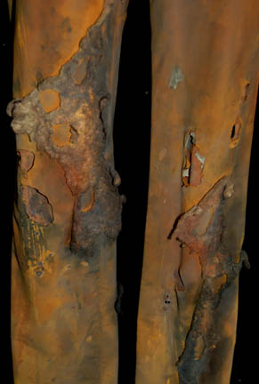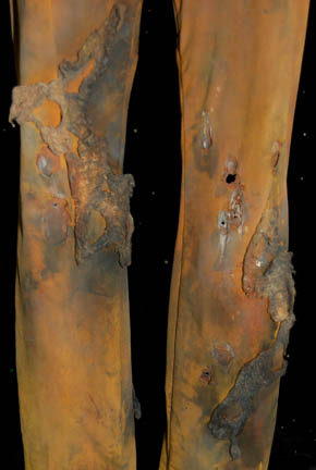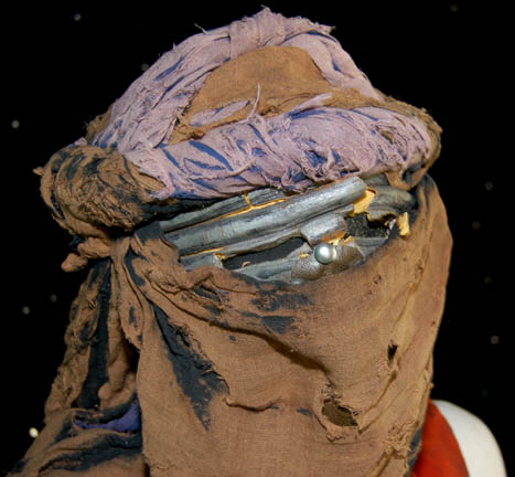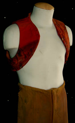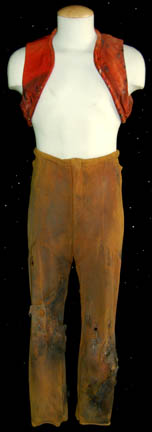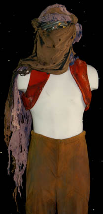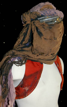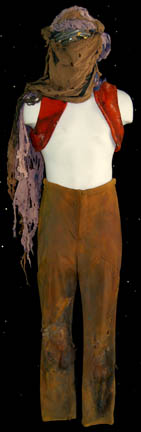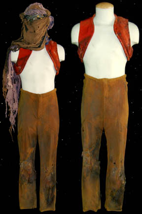 Description: A costume featured in Star Trek II: The Wrath of Khan for wear by one of “Khan's” (Ricardo Montalban) genetically engineered henchmen. The costume is a pair of tan trousers and a trio of orange vests all distressed to appear worn, dirty, and made from furniture upholstery. The items feature tears, holes, and general thrashing as well as sewn in Paramount tags. Additionally, the costume features a head wrap with a broken face mask and trashed drapes. The tags indicate use by ‘Brett Baxter Clark’.