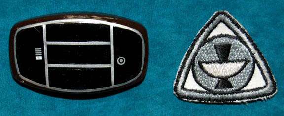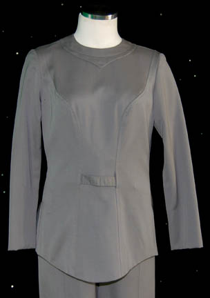 Description: A gray 2-piece Class-A Starfleet uniform featured in Star Trek I: The Motion Picture. The lot comes with an unattached plastic bio-monitor, unattached matching cloth covered shoes, and a command white backed Epsilon IX station assignment patch for the left breast. The item is intended for female wearers. The trousers are overalls style.