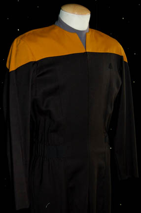 Description: “Harry Kim” (Garrett Wang) was the Operations Manager onboard the U.S.S. Voyager during the Star Trek: Voyager series. This is his Starfleet uniform including a black jumpsuit with operations gold shoulders and a small Velcro patch for a combadge (sold separately) to attach. The gray undergarment has built in shorts and a zip up the back. The sewn in tags read “Voyager – Garrett Wang, 6-22-00”.