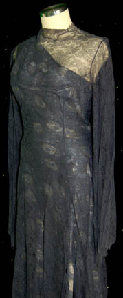 Description: “Onaya” (Meg Foster) was a non-corporeal being that took on Human form and was featured in the Star Trek: Deep Space Nine episode “The Muse” in which she fed off the creative energies of “Jake Sisko” (Cirroc Lofton). The costume includes a blue and silver patterned dress that hangs off the right shoulder and has stylized slits up the left side. A beautiful over dress is delicate detailed blue lace also with a stylized slit and clear snaps in the back. The corresponding trousers are blue with built-in heels. Costume comes complete with costume tag.