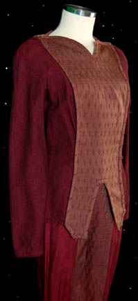 Description: A costume featured in the Star Trek: Deep Space Nine episode “The Passenger”, wherein a criminal attempts to hide his consciousness in the body of “Dr. Bashir” (Alexander Siddig) when he fears that his own body is about to die. This costume is for wear by Caitlin Brown in the role of a Kobliad security officer that is tracking the criminal, “Ty Kajada”, and is long-sleeved jacket in the jacquard woven style, featuring a maroon, lightly textured, diamond-shaped pattern, a lighter shaded panel along the front and back with its own fashion of diamond shapes, a zip down the back that tucks into overall-style trouser in the same double diamond motif, and stirrups for feet. This is the version of the costume the character was wearing when she was rescued from her damaged ship so it is distressed to reflect this with a few stains on the trousers and jackets. Kaitlin Brown also played "Vekor" on the TNG feature length episode "The Gambit: Part I & II" and this costume was later used as a photo double version of what the aged “T'Pol” (Jolene Blalock) wore on the Enterprise episode “E²”.