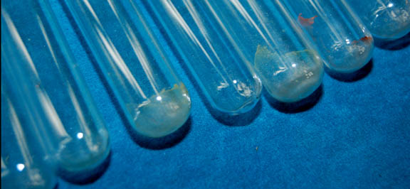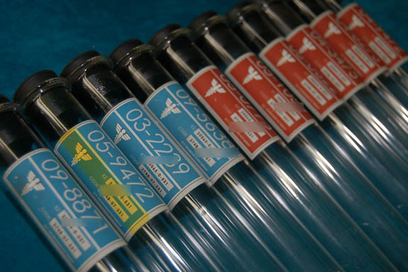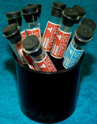 Description: A set of props similar to those featured in various episodes of Star Trek: Enterprise for use by “Dr. Phlox” (John Billingsley) in sickbay. This lot includes a total of ten test tubes all with rubber stoppers and featuring Starfleet inventory stickers with individual serial numbers on each, a small amount of colored fluid in the bottom of each, and a sturdy black, plastic receptacle to store them in. Each test tube measures approx. 8 X 1 circular inches and the receptacle measures approx. 5 X 4.5 inches respectively.