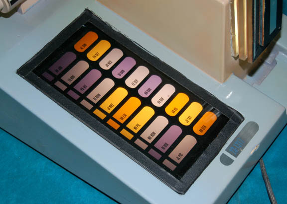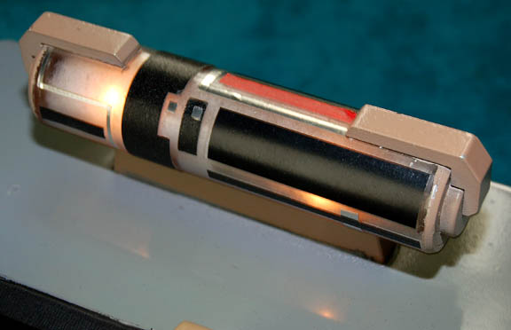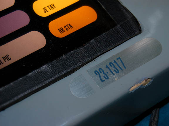 Description: A Starfleet sickbay console located in “The Doctor's” (Robert Picardo) office and featured in the Star Trek: Voyager episode “Someone to Watch Over Me”. The piece is made of particleboard with a raised brown section that has black and silver applications applied for detail and an internal light. A cylindrical section on the top has black, red and silver applications applied for detail and has sequentially flashing white lights inside. The LCARS style panel features multicolored buttons that are backlit by two rod bulbs. Only one rod bulb is working however it still lights up the panel nicely. The panel has black tape around it and can be removed to change out the light bulbs. The piece is powered by a standard U.S.A. 120Volt Type A two-pronged plug. Measures approx. 12 x 14 x 8 ½ inches.