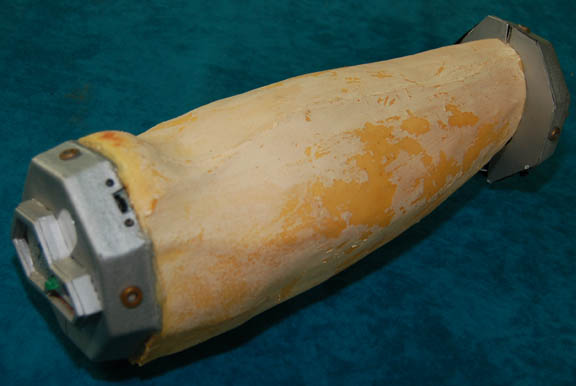 Description: “Dr. Soong” (Brent Spiner) was a cyberneticist who created the Soong-type androids including “Data” (Brent Spiner) and “Lore” (Brent Spiner). These are Soong-type android parts made for use during the filming of Star Trek episodic television. The lot includes two cast foam lower legs, one foot and one hand. Each is painted to appear like android “Skin” however due to time and use the paint is flaking off. At each end of the limbs and on the end of the foot and hand are gray plastic compartments with silver and red labels for detail. Each has a flashing green LED light housed on it that is activated by a switch on the side however only two of them work. Due to time and use some of the plastic is breaking away from the foam limbs. The biggest limb measures approx. 14 x 4 ½ inches diameter.