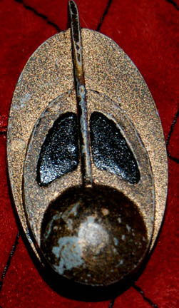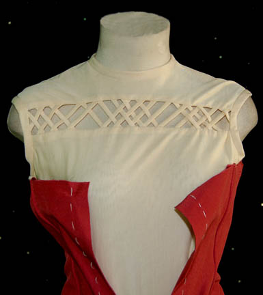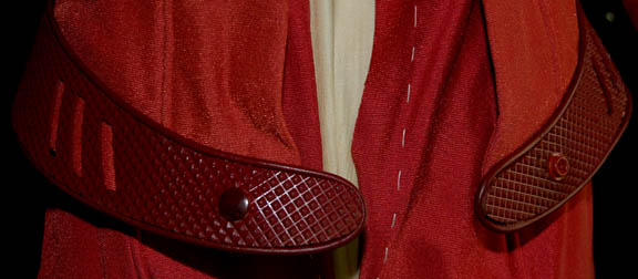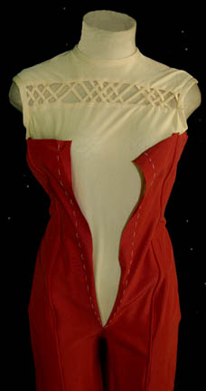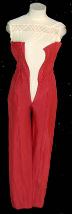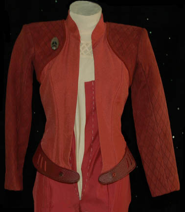 Description: A costume featured in Star Trek: Deep Space Nine for wear by Nana Visitor in her portrayal of “Major Kira”. The costume is a rust colored Bajoran military style jacket with an open, unsealing, front, suede diamond pattern sleeves and shoulders, an affixed vinyl belt, and a Velcro placement for an accompanying bronze colored metal Bajoran combadge. The costume also comes with a cream colored sleeveless shirt with a crisscrossing ‘X' patterned opening around the chest and back, and salmon colored trousers that are unfinished. The costumer’s tag reads ‘Kira, Nana Visitor, 1 Bajoran uniform’ and lists the components including ‘pant – salmon (unfinished)’.