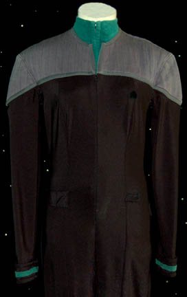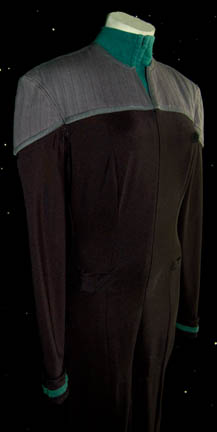 Description: A costume featured in various episodes of Star Trek: Deep Space Nine for wear by Terry Farrel in her portrayal of “Jadzia Dax”. ”. The costume is a black Starfleet uniform jumpsuit with a form fitting elastic waist, ‘away team' gear loops sewn into the waist, quilted gray shoulders, a Velcro placement for a Starfleet combadge (sold separately), and sciences blue division strips around the cuffs. The costume also comes with a sleeveless sciences blue uniform undershirt with a sewn in Deep Space Nine tag reading ‘Terry Farrel’. The costumer’s tag reads ‘DS9, Dax, Terry Farrel’.