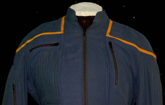 Description: A Starfleet uniform jumpsuit with command gold division strips around the shoulders made for Scott Bakula in his portrayal of “Captain Archer”. The costume is in almost perfect condition, made from fabric used during the first season of Star Trek: Enterprise. The uniform features multiple zippered pockets and Velcro size adjustments at the ankles and cuffs and comes with a black button front long sleeved undershirt. The sewn in Enterprise tag reads ‘Scott Bakula' while the costumer’s tags read ‘Archer, Scott Bakula, #A04, Starfleet Uniform, Not Finished’ and ‘Scott, Do not use this season, Needs to go to PCL’. Indeed, the usually buttoned down loops on the back of the waist are pinned to the costume instead of buttoned and white thread is present, the costume is also missing an “Enterprise NX-01” assignment patch, usually found on the left shoulder.