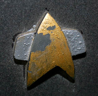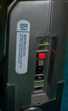 Description: A 24th century electronic prop “Emergency Generator” made for use during the filming of Star Trek episodic television. It is made of resin painted gun-metal gray with multiple Starfleet labels applied to its surface. The main label is titled “Emergency Generator – EG887”. There are multiple switches on each side however only one activates sequentially flashing red LED lights on each side and a static red light on the front. The case is taped shut. Due to time and use the paint is flaking off in places, most notably on the raised painted Starfleet emblem on the front. Measures approx. 10 ½ x 15 x 6 inches.