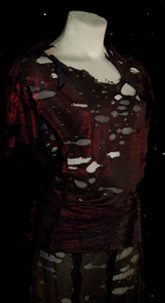 Description: A stunt costume featured in the Star Trek: Enterprise episode “Borderland”, “Cold Station 12”, and “The Augments” for wear by Chris Leps in his portrayal of “Malik”. The costume is a lot comprised of form fitting trousers, one set made from iridescent silver material and another of gold colored material, both featuring multiple tears and rips placed strategically, and an equally distressed pair of shirts, one silver and the other iridescent red. The two costumes come with a pair of tags reading ‘081-082 Stunt Malik, Chris Leps' and ‘081-082 Trey Murphey , ND augment’. A third costumer’s tag reads ‘Enterprise #80, 81, 82, ND + Stunt, Male Augments’.