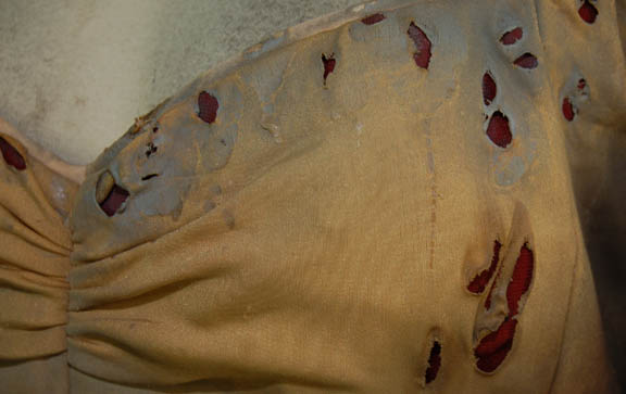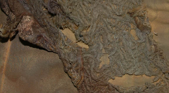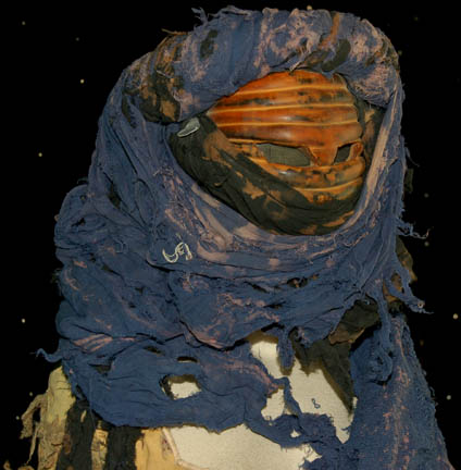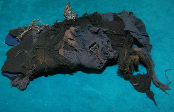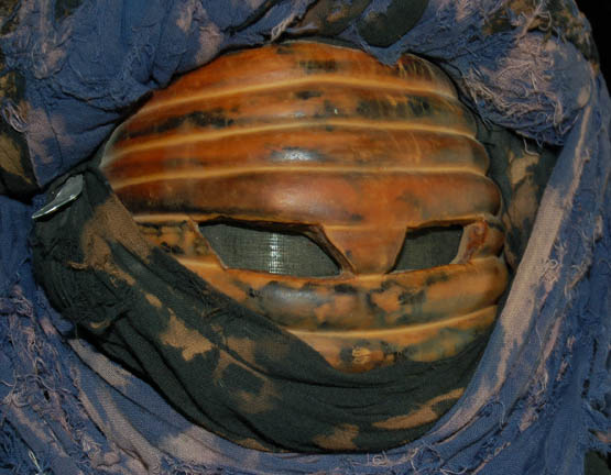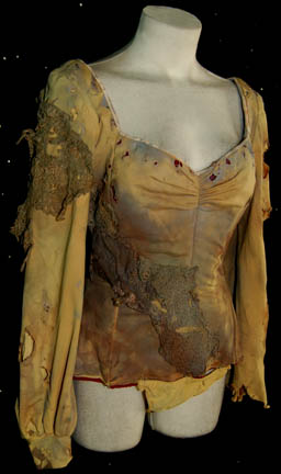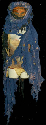 Description: A costume featured in Star Trek II: The Wrath of Khan for wear by Laura Banks in her portrayal of “Khan's Woman”, or “Khan’s Navigator”. The costume is made up of three separate, but all distressed tops, all with stains, tears, holes, thrashing, rips, and made to appear as though it was put together out of various materials. The costume features separate extra bands with grommets, a neoprene glove with rags attached, a molded rubber face mask with a blue rag head wrap, and multiple costumer’s tags reading ‘Star Trek II, 60190-100, Laura Banks as Khan’s Woman, Chg#1, sc.#25, 45, 48, 71, 74, 86, 95, 100, 155-190, 200A-216’, and others indicating similar information about being a single, double, or triple costume.