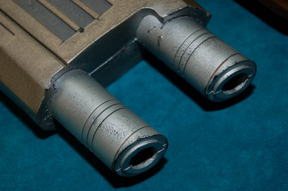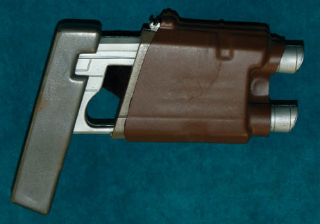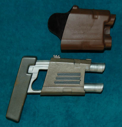 Description: A prop energy pistol featured in various episodes of Star Trek: Enterprise for use by actors portraying Nausicaans. The prop is a metallic silver painted hand gun with twin discharge barrels, a hand grip and a bracket, all molded as a single piece from foam rubber. This sturdy prop fits easily into a brown colored vacuum formed holster with black felt lining for no scratch use. The holster features a ‘Bianchi International' universal military holster clasp on the reverse, and together, they measure approx. 10 X 7.5 X 2.5 inches.