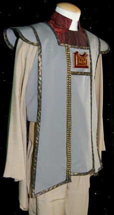 Description: A costume featured in Star Trek VI: The Undiscovered Country for wear by Vulcan Khitomer Attendees. The costume is trousers with a top with matching sleeves. The top features a red iridescent flower patterned chest and is worn under a gray tabard with gold patterned trim lines and a Vulcan badge centered on the chest.