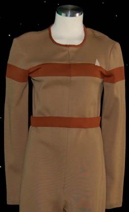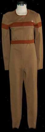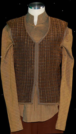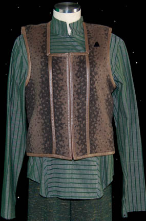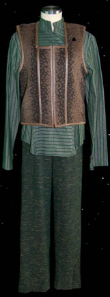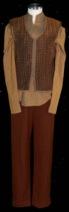 Description: A lot of costume elements featured in various episodes of Star Trek: Deep Space Nine for wear by Cirroc Lofton in his portrayal of “Jake Sisko”. The lot is comprised of two sets of trousers, one brown and one green knit with white accents, a tan jumper with a brown stripe across the chest and a belt like the one appearing in the episode “The Jem'Hadar”, a green shirt with dark green stripes and a mustard colored shirt with white stripes, and a mustard colored vest with crisscrossing and reflective gold spots in the hatches. All elements feature sewn in tags reading ‘Cirroc Lofton’ and the costumer’s tags read ‘DS9 Season 6, 7, Jake Sisko, Cirroc Lofton’, another one is for the jumper and indicates the existence of two others.