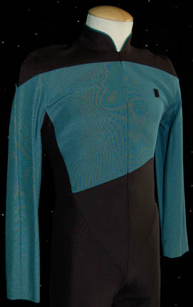 Description: A Star Trek: The Next Generation male Sciences blue Starfleet uniform made for wear during the series, ‘The Next Generation' movies and/or Deep Space Nine. The jumpsuit is black with Sciences blue sleeves and upper torso. There is blue trim around the collar, a small Velcro patch on the left breast for a Combadge (not included) to attach and a zip up the front. Costume comes with costume tag.