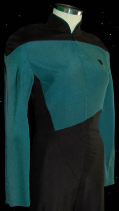 Description: A Star Trek: The Next Generation female Sciences blue Starfleet uniform made for wear during the series and/or ‘The Next Generation' movies. The jumpsuit is black with Sciences blue sleeves and upper torso. There is blue trim around the collar, a small Velcro patch on the left breast for a Combadge (not included) to attach and a zip up the front. Costume comes with costume tag.