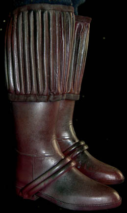 Description: A costume featured in the Star Trek: Deep Space Nine episode “Rules of Engagement”; wherein the Klingon Empire attempts to extradite “Lt. Worf” (Michael Dorn) for supposedly destroying a Klingon transport full of civilians. This costume is one of the Klingon children in “Worf's” dream before he wakes up in the holding cell awaiting trial; it is a long-sleeved, teal-colored shirt featuring multi-colored, wool along the sides and sleeves, faux fur along the shoulders and halfway down the arms, overall-style trousers of a dull blue with multi-colored dots, stirrups for the feet, maroon gauntlets and gorget, and matching, knee-length, boots. A sewn in tag reads ‘Deep Space Nine, James McCloskey’ and a costumer’s tag that reads ‘DS9 #490, Klingon Child’.
