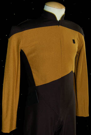 Description: A Star Trek: The Next Generation male Operations gold Starfleet uniform made for wear during the series and/or ‘The Next Generation' movies. The jumpsuit is black with Operations gold sleeves and upper torso. There is gold trim around the collar, a small Velcro patch on the left breast for a Combadge (not included) to attach and a zip up the front. There is a Velcro patch on the right side for Away Team gear (not included) to attach. Costume comes with costume tag.