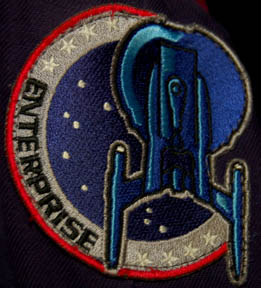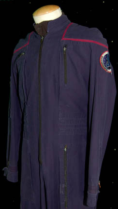 Description: A male Starfleet jumpsuit with Engineering red trim around the shoulders made for use during the Star Trek: Enterprise series. It has a famous NX-01 Enterprise patch on the left sleeve, a zip up the front and multiple zippered pockets. There are zips and adjustable Velcro fasteners at the cuffs and ankles. There is intentional distress around the right pocket and several flecks of glue on the back. Worn under the jumpsuit is a sleeveless black shirt with buttons up the front. Costume comes complete with costume tag.