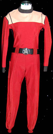 Description: A Starfleet crewman's uniform appearing in Star Trek feature films starting with Star Trek II: The Wrath of Khan. The costume is a red jumpsuit with a tan chest and back, has multiple lines of piping, and a ribbed collar and cuffs colored black indicating the wearer to be a crewman (as opposed to a trainee). The uniform is accompanied by these unattached elements: a full six silver colored name badges inscribed with the name ‘DAX’ etched into them, a red trimmed yellow division strip for the left sleeve forearm, a pair of yellow division strips for the shoulders, a red placement with a silver colored metal badge affixed to it indicating the wearer to be an ‘able-seaman’ (no referenced to the character of “Dax” indicate his rank in the movie), and a bronze colored wire backed metal Starfleet emblem for the left breast. The character of “Dax” was portrayed by Michael Snyder in Star Trek VI: The Undiscovered Country, he was the patsy into whose locker was planted the gravity boots used during the assassination on the Klingon flagship. The costume was located separately of the elements which were located together with a tag reading ‘Michael Snyder as DAX S.T. VI’. The Starfleet badge was located separately of the costume as was the black leather belt with the silver colored metal Starfleet emblem buckle which is inscribed ‘Louis Ortiz’.