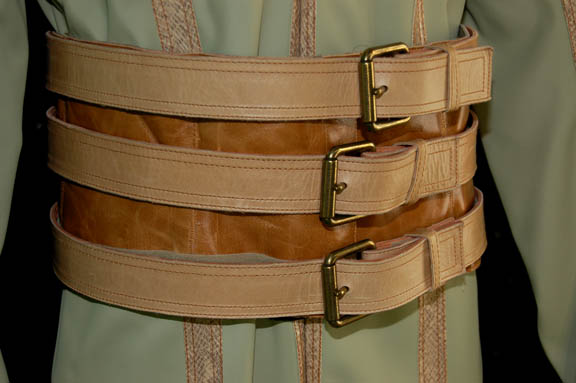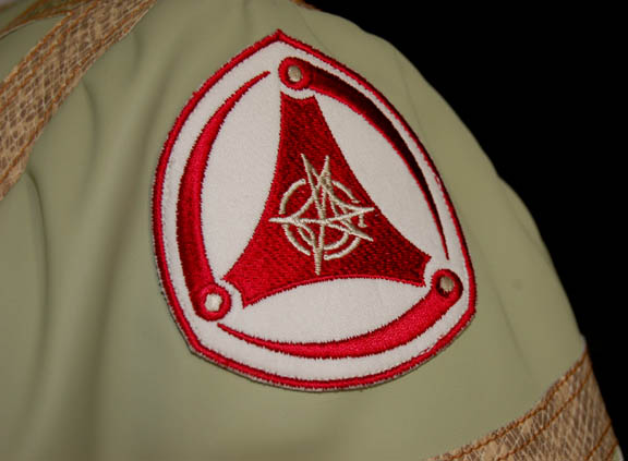 Description: A costume featured in the Star Trek: Enterprise episode “The Shipment”; wherein the “Enterprise NX-01” comes upon a Xindi mining outpost where a substance being used in the Xindi Super weapon is being produced. This costume is for wear by Jack Alsted in the role of one of the Xindi-Arboreal working under “Gralik” (John Cothran Jr.) at the kemocite mining facility and refinery; it is a long-sleeved, full-length jumpsuit in a very light green, vinyl fabric featuring brown, stitched accents with a faux scale pattern all along the garment, a Xindi patch on the both shoulders, Velcro patches for a wide, brown belt with three smaller, lighter brown belts Velcro'd to it. A sewn in tag reads ‘Enterprise, Jack Alsted’ and the costumer’s tag reads ‘#59 Enterprise The Shipment, Sloth #2, Jack Alsted’.