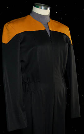 Description: A female Operations Gold Starfleet uniform made for wear during the Star Trek: Voyager series. The uniform is black with Operations gold shoulders, a small Velcro patch on the left breast for a Combadge (not included) to attach, a zip up the front and two pleats in the back. Around the waist are loops for away-team gear (not included) to attach. A gray long sleeved undershirt accompanies the jumpsuit. Costume comes complete with costume tag.