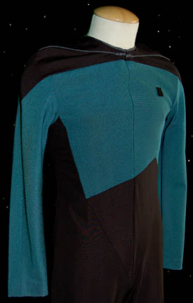 Description: A male first season Star Trek: The Next Generation Starfleet Sciences Blue uniform made for wear during the series. The jumpsuit is black with Sciences blue sleeves and upper torso. There are two bands of blue trim around the collar, a small Velcro patch on the left breast for a Combadge (not included) to attach and a zip up the front. Costume comes with costume tag.