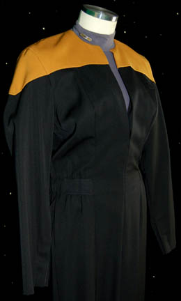 Description: A costume similar to those used throughout the Star Trek: Voyager series. This costume is for wear by Roxann Dawson in the role of the half-Klingon Chief Engineer “B'Elanna Torres”; it is the standard, type-B Starfleet uniform consisting of a looser, black jumpsuit with the division colors along the shoulders, hoops at the waist for tools, a Velcro patch for a commbadge (not included), stirrups for the feet, a blue-gray, long-sleeved undershirt with a place to button the appropriate provisional rank pips (included). A sewn in tag reads ‘Voyager, Roxann Dawson’.