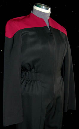 Description: A female Command Red Starfleet uniform made for wear during the Star Trek: Voyager series. The uniform is black with Command red shoulders, a small Velcro patch on the left breast for a Combadge (not included) to attach, a zip up the front and two pleats in the back. Around the waist are loops for away-team gear (not included) to attach. A gray long sleeved undershirt accompanies the jumpsuit.