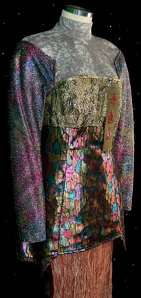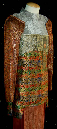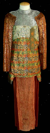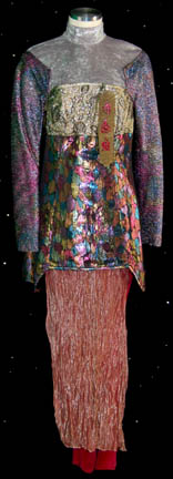 Description: A pair of male and female costumes featured in the Star Trek: Deep Space Nine episode “Move Along Home” for wear by “Wadi” visitors to the station. The costumes are plum colored velour jumpsuits with elaborate attached tops with multiple iridescent and sparkling fabrics, and loads of intricate patterns. These excellent pieces both feature custom iconographic lettering on sewn on badges on the front left of the torso, and both come with iridescent loin cloths that attaché with clasps. One of the tangerine colored ones has a visible tear in it. The costumer's tags read ‘410 DS9 “Sore Losers” N.D. Wadi’ and indicates the wearer. The episode title was changed from “Sore Losers” to “Move Along Home” before airing.