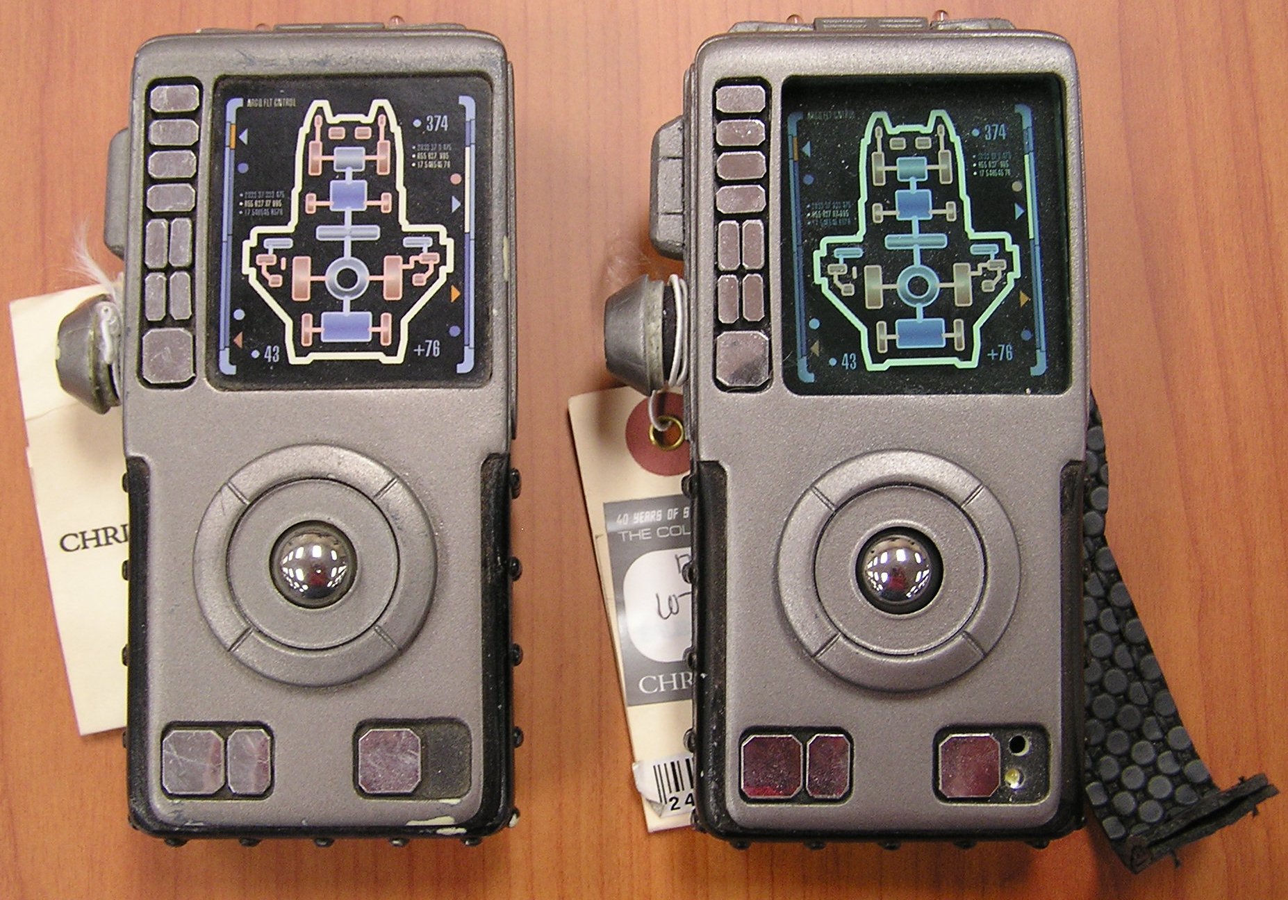 Description: Two prop remote control devices, one made of solid cast resin and one with loose interior electronics and screen; and two small prop control panels with raised printed button detail -- made for the Argo land vehicle in <I>Star Trek: Nemesis</I> (4)