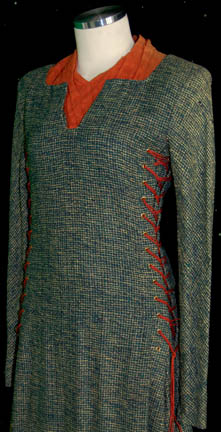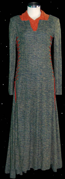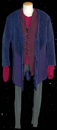 Description: A lot of costumes featured in the Star Trek: The Next Generation episode “Homeward” for wear by Paul Sorvino as “Nikolai Rozhenko” and Penny Johnson as “Dobara”. The lot is trousers and a purple shirt from the end of the episode with a multi-colored vest as well as a blue coat for wear by Paul Sorvino. Also, Penny Johnson's costume is a green dress with an affixed orange undergarment and laces up the sides. Sewn in tags indicate use by Penny Johnson and Paul Sorvino, as well as other actors. The costumer’s tags indicate use in episode ‘# 265 Homeward’ and list the credited actor’s names and the components. Penny Johnson would go on to play “Kasidy Yates” in Deep Space Nine.