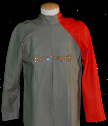 Description: An excellent gray jumpsuit with an orange sleeve and working electronic lights featured in the Star Trek: Voyager episode “Repentance”. The lights are powered by a single 9volt battery held internally that activates by way of a switch. The costume features a sewn in ‘MUTO Little, Los Angeles' tag and comes with a costumer’s tag reading ‘#259 “Repentance”’. The costume is distressed to appear ‘dirty’.