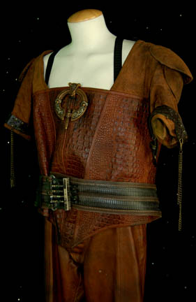 Description: The Orions are a humanoid species with distinct green skin from the Orion planet. This elaborate uniform was worn by an Orion guard in the Star Trek: Enterprise episode “Borderland”. It features incredible leather trousers with a built in codpiece. There is a zip up the back and stirrups at the feet. The body piece is made of reptilian print leather with lacing up the back, buckles around the cuffs, layered leather covered shoulder armor, chains and a painted resin emblem attached on the front. Also included is a lattice and stitched pattern belt with a detailed metal buckle and two corresponding leather wrist gauntlets. Costume comes complete with costume tag that reads “Enterprise #80 Borderland – Orion Guard”.