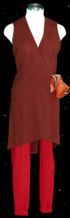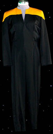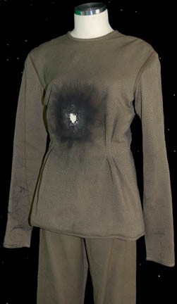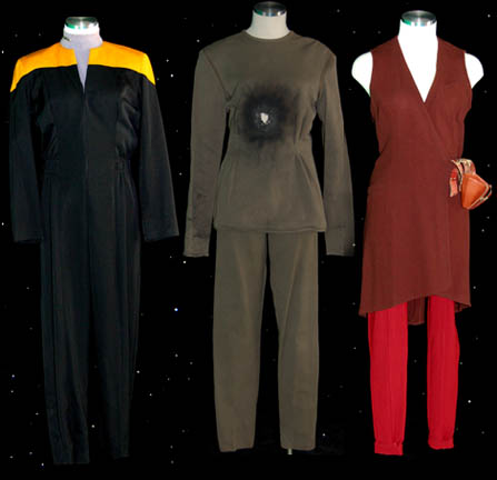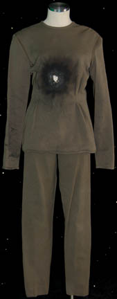 Description: A lot of costumes featured in various Star Trek: Voyager episodes for wear by Roxann Dawson in her portrayal of “B'Elanna Torres”. Contained in this lot is a Starfleet uniform jumpsuit, black with operations gold shoulders with a gray undershirt with sewn in voyager tags reading ‘Roxann Dawson’, a set of patterned olive colored trousers with a matching distressed long sleeved top with a ‘burn mark’ and hole in the center chest featured in the episode “Faces” with sewn in Voyager tags reading ‘Roxann Biggs’, and a set of maroon trousers and a brown robe. Costumer’s tags are present. A small holster made from brown leather with Velcro placements was located with the costumes.