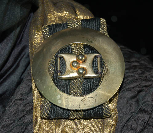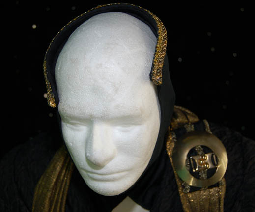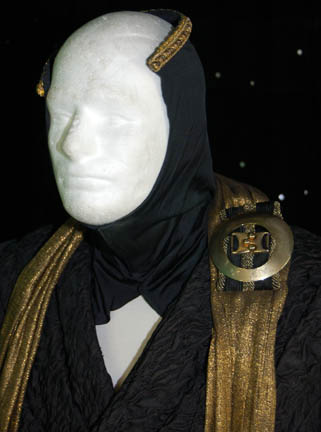 Description: A costume featured in the Star Trek: Deep Space Nine episode “Business as Usual”; wherein “Quark” (Armin Shimerman) nearly bankrupts himself and goes to work for his cousin “Gaila” (Josh Pais), a weapons dealer. This costume is for wear by Lawrence Tierney in the role of the enormously wealthy Regent of Palamar who was attempting to purchase biogenic weapons from “Gaila”; it is a long-sleeved, full-length, black robe featuring a wrinkled texture, a gold-colored sash with a metallic sheen, further gold-colored buckle accent just off the shoulder and tassels at each end. There is what appears to be a matching, gold-trimmed hood and associated garment that were both found with the costume but there doesn't appear to be any evidence of it being worn in the episode. A sewn in tag reads ‘Deep Space Nine, Lawrence Tierney’ and the costumer’s tag reads ‘DS9 #516, Regent, Lawrence Tierney’.