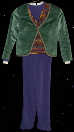 Description: A lot of two children's costumes made for wear in “Captain Picard’s” (Patrick Stewart) Christmas fantasy scene in Star Trek VII: Generations. The first is a male boy costume that includes a blue wool jumpsuit with white cuffs and collar, a multicolored square patterned waistcoat and a green patterned jacket with brown and green trim. The second is also a male boy costume and includes a multicolored striped waistcoat and a crimson patterned coat. Costumes come complete with costume tags that each read “ST VII “Generations” Child in Picard’s Xmas fantasy”.