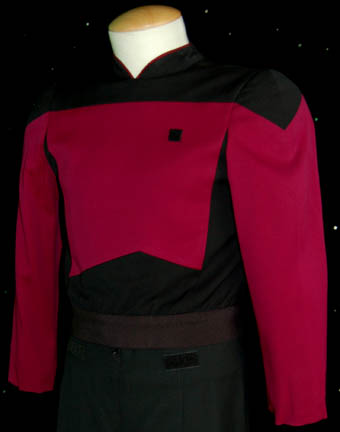Description: A 2 piece Starfleet uniform colored command red with black trousers. The trousers feature a sewn in tag indicating use in Star Trek VII: Generations and the uniform jacket features a sewn in tag indicating use on Star Trek: The Next Generation. The uniform is intended for male wearers.