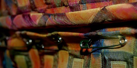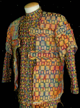 Description: An unfinished costume made for Ethan Phillips in his portrayal of “Neelix” in episodes of Star Trek: Voyager. The costume is brightly colored and is composed of patterned trousers, a matching jacket with multiple lines of piping, and a multi-colored long sleeved shirt. The shirt is finished and features a sewn in Voyager tag reading ‘Ethan Phillips', the jacket has an asymmetrical front and multiple pins holding the closure system to the fabric. The costumer’s tag reads ‘John Phillips “Neelix” not finished’ and lists the components.