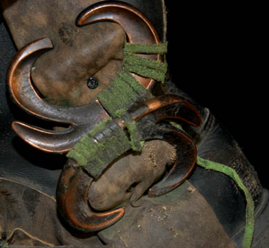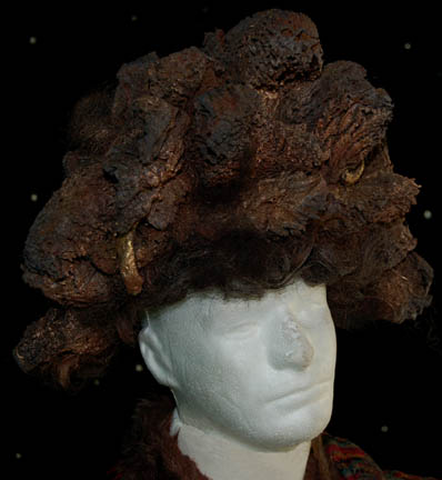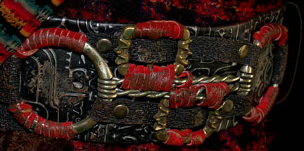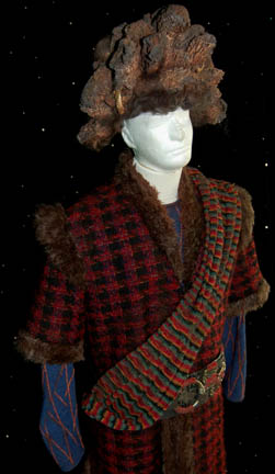 Description: A costume featured each part one of the second season finale episode “Basics: Part I”; wherein the Kazon –Nistrim successfully take over “Voyager” and strand the crew on a desolate, primitive planet. This costume consists of a long-sleeved, blue tunic with a raised, diamond-shaped pattern on the sleeves and radiating down from the collar, magenta colored trousers in a multi-colored checkered pattern with stirrups for the feet; a multi-colored, striped sash that goes over the shoulder with a wide belt that has various metal and gold colored accents attached to it and red, leather straps around them, a robe-length woven jacket featuring a black and red checked design, faux fur accents, black leather boots with copper colored metal accents and green leather strap wrapped around them, and one of the trademark Kazon wigs with artificial hair in clumps made to look like it grows that way. All items are distressed for appearance, the sewn in tag reads ‘Voyager, Tom Miller' and the costumer’s tag reads ‘Voyager, 142 Basics Part I, Kazon #1, Scott Haven’.
