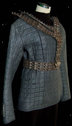 Description: A Romulan costume featured in Star Trek: Deep Space Nine for wear by Romulan Tal'Shiar agents. The costume is a black thermal body suit, an iridescent gray patterned jacket top, and a Dry-Deck belt and harness. The costume features a wired on Romulan Star Empire badge and a Tal’Shiar badge attached to the right sleeve via a Velcro placement. Sewn in tags indicate use on Star Trek: Deep Space Nine and Voyager.