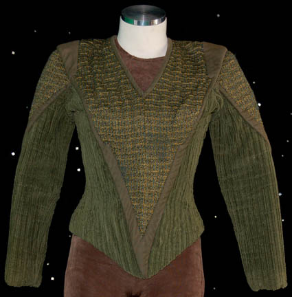 Description: A costume featured in the Star Trek: Deep Space Nine episode “Destiny”; wherein the Federation, Cardassian Union, and Bajorans attempt a joint scientific expedition to place a wormhole relay in the Gamma Quadrant as an early warning against Dominion attack but find that The Obsidian Order has other plans for the relay. The costume is for wear by Jessica Hendra in the role of an Obsidian Order Operative called “Dejar” that is posing as a scientist on the joint expedition but with orders to sabotage it and the chance for more peaceful dealings between all three groups; a sleeveless, full-length, olive-colored jumpsuit with a metallic sheen and stirrups for the feet. Also included is a long-sleeved tunic/jacket with a neoprene-like base, a triangular portion extending down from the collar that has a woven motif in greens and yellows; olive-green corduroy along the side and sleeves, and wide, green piping all along the front and back. A sewn in tag reads ‘Deep Space Nine, Jessica Hendra' and the costumers tag reads ‘461 DS9 Destiny, Dejar, Jessica Hendra, Cardassian’.