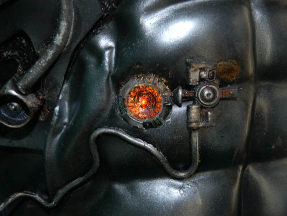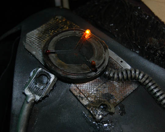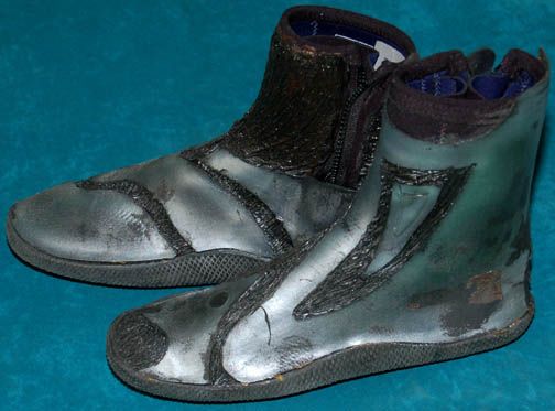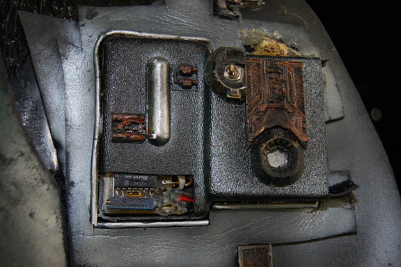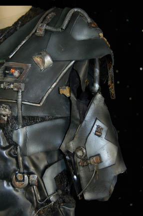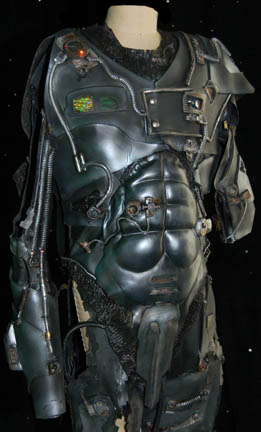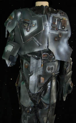 Description: The Borg are an eclectic race of cyborgs with a single goal – perfection. There are no individuals, only members comprised of many species that were assimilated into the collective. They are considered to be the most threatening force in the galaxy. They were featured throughout the Star Trek anthology however this Borg child costume was made for wear by “First” (Ryan Spahn) from the Star Trek: Voyager episode “Collective”. The costume includes a black vinyl sleeveless jumpsuit with black and gray neoprene and foam components to resemble machine-style muscle structure. A body top is worn over the jumpsuit also with neoprene and latex components. A 9Volt battery compartment and switch on the back of the costume activates multiple multicolored flashing LED lights on the front. The costume is complete with corresponding shoes. Costume comes complete with costume tag that notes “Falling apart” however the costume appears to be relatively intact apart from some minor partially unstuck elements.
