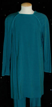 Description: A costume featured in multiple Star trek episodes with multiple sewn in Voyager tags indicating use by ‘Rick Worthy', ‘Tim Russ’, ‘Robbie McNeil’, ‘Jeff Austin’ who portrayed the alien “Allos” in “The Omega Directive”. The trousers feature sewn in Voyager tags reading ‘Ethan Phillips’ and ‘Glen Goldstein’.