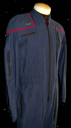 Description: “Trip Tucker” (Connor Trinneer) was a Human who served onboard the U.S.S. Enterprise NX-01 as chief engineer during the Star Trek: Enterprise series. This is his Starfleet jumpsuit with Engineering red trim around the shoulders made for use during the show. It has a famous NX-01 Enterprise patch on the left sleeve, a zip up the front and multiple zippered pockets. There are zips and adjustable Velcro fasteners at the cuffs and ankles. Attached to the right breast are three metal rank pips. The sewn in tag reads “Enterprise – Connor Trinneer”. Worn under the jumpsuit is a sleeveless black shirt with buttons up the front. Also included is a second “Trip” sleeveless black shirt and a blue sleeveless tank top. All of the tops have sewn in tags that read “Enterprise – Connor Trinneer”. Costume comes complete with costume tag that reads “Trip, Connor Trinneer, #T13, Starfleet Uniform”.