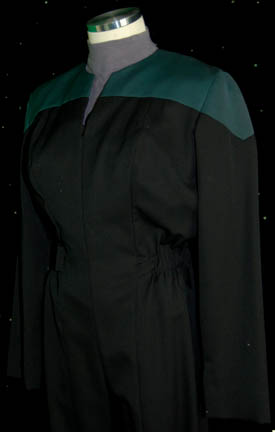 Description: A costume featured in the Star Trek: Voyager episode “Author, Author”; wherein “The Doctor” (Robert Picardo) sends his holonovel “Photons Be Free” to Earth to be published, requests time for a rewrite, but is blatantly ignored by the publishers stating that they needn't abide by his wishes because he is “only a hologram”. This costume is for wear by Kate Mulgrew in the role of “Captain Kathryn Janeway” when running “The Doctor’s” program and is the Emergency Medical Hologram herself; it is the standard Type-B Starfleet uniform consisting of a long-sleeved, full-length black jumpsuit featuring Science Division Blue around the shoulders, a Velcro patch for a commbadge (not included), hoops at the waist for tools, a zip down the front, stirrups for the feet, and a long-sleeved, blue-gray undershirt. A sewn in tag reads ‘Voyager, Kate Mulgrew’.