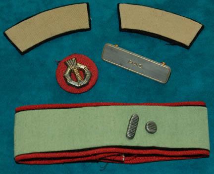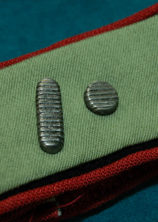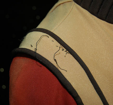 Description: A Starfleet uniform jumpsuit appearing in various Star Trek feature films. The costume is a red jumpsuit with a black ribbed collar and cuffs indicating the wearer to be a crewman, with affixed belt loops, and tan shoulders. The costume comes with these unattached elements: A metal name badge with ‘RAZ' etched into it, a red placement for the left sleeve with a silver and gold colored metal rank badge indicating the wearer to be a ‘senior chief petty officer’, a pair of medical green division strips for the shoulders, a green division strip for the left sleeve below the rank with an affixed silver colored metal commendation bar and a ‘5 year service’ pin and an unattached ‘10 year service’ pin The costume is intended for female wearers. Threads remain from removed elements on the shoulders and the left sleeve.