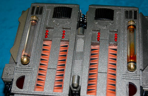 Description: A lot of two prop items featured in the Star Trek: Enterprise episode “Vanishing Point”; wherein “Ensign Sato” has her first transporter experience and thinks that something is happening to her molecules because of it. The first item is part of a series of explosive devices that “Ensign Sato” imagined she saw aliens hooking up to vital systems on the “Enterprise NX-01”; it is a roughly rectangular device, resin cast in a pewter shade, bisected into two identical segments each with a black box at the top, twin clear segments featuring a red background and black triangular accents, two sets of four red LEDs, a tube with an orange colored fluid, a prop “dial” on the other end, faux “circuitry” with wires leading out of it and both pieces screwed together and tied with wire on the bottom. Item has untested electronics and measures approx. 6 X 6.5 X 2 inches. The second device is semi-circular, resin cast in pewter shade, separated into various sized segments, features black accents around the left side and white around the right with a bank of red lights just underneath; a textured pink area on bottom of the left side, further white accents on the lower right hand side, Allen-wench access ports on the bottom and a switch that would activate the untested electronics. This item measures approx. 9 X 5.5 X 1 inches.