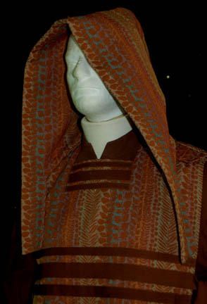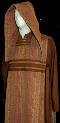 Description: A lot of costumes featured in the Star Trek: Enterprise episode “Cold Front”; wherein “Captain Archer” finds that a member of his crew is reputedly from the nine-hundred years in the future and hunting the Suliban “Silik” (John Fleck). This lot consists of a costume for wear by Leonard-Kelly Young in the role of one of the pilgrims that the “Enterprise NX-01” ferries to view “The Great Plume”, “Sonsorra”, it is a long-sleeved, full-length, brown robe with matching overall-style trousers and dickie; a full-length, multi-colored tunic featuring vertical stripes in a rust-colored floral pattern with brown, horizontal stripes that become sashes on the sides and a matching hood. The lot also consists of two more identical costumes for unnamed pilgrims. A sewn in tag in the “Sonsorra” costume reads “Leonard-Kelly Young” and the two other pilgrim costumes' tags read “Robert Middleton” and the other “Cary Lee Sato” respectively; the costumer’s tags read ‘Enterprise #011 Cold Front, Sonsorra, Leonard-Kelly Young’ and ‘Enterprise ep #011 Cold Front, brown Alien Pilgrims, Cary Lee Sato, Robert Middleton’.